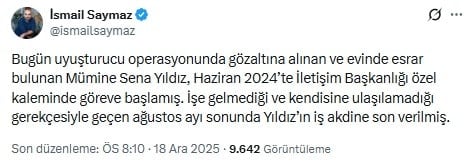 “Bugün uyuşturucu operasyonunda gözaltına alınan ve evinde esrar bulunan Mümine Sena Yıldız, Haziran 2024’te İletişim Başkanlığı özel kaleminde göreve başlamış. İşe gelmediği ve kendisine ulaşılamadığı gerekçesiyle geçen ağustos ayı sonunda Yıldız’ın iş akdine son verilmiş.”