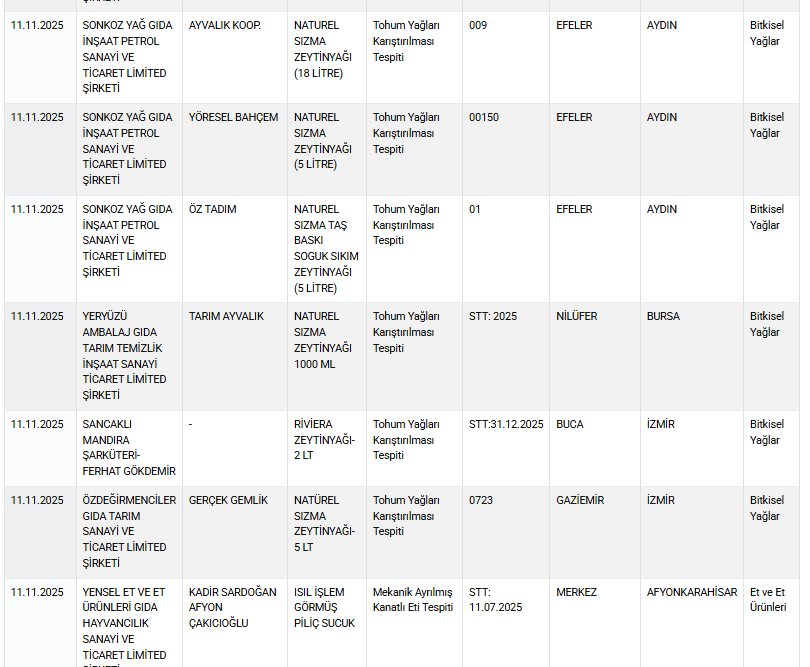 Ticaret Bakanlığı, 11 Kasım 2025 tarihli denetim sonuçlarını kamuoyuna duyurdu. Denetimlerde özellikle bitkisel yağlar ve et ürünleri grubunda ciddi uygunsuzluklar tespit edildi.